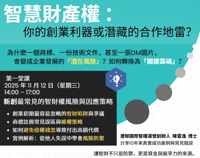 台灣科技新創基地 免費講座教你避坑升級,讓智慧財產成為你的競爭優勢!