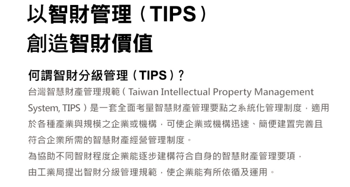 提供經濟部工業局台灣智慧財產管理制度(TIPS)認證輔導。TIPS已全面考量智權管理的主要重點,並以規範條文形式呈現。企業可藉由TIPS審視公司內部的智權管理制度,並直接利用TIPS建置更完整的智權制度。